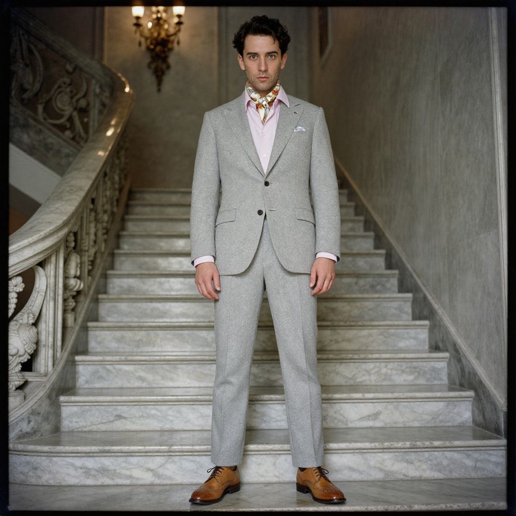 A man, light grey wool suit, pale pink dress shirt, floral silk scarf, tan leather brogues, grand marble staircase, ornate chandeliers, daguerreotype film, confident expression Man has masculine face and piercing eyes