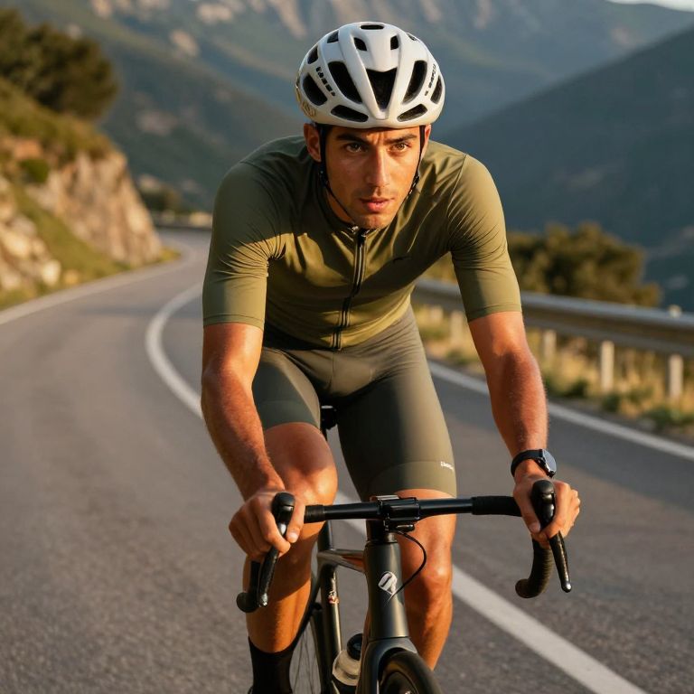 A lone cyclist with a sun-kissed olive complexion and piercing hazel eyes, pedaling confidently through a mountain pass at golden hour, wearing a custom-fitted racing uniform with reflective detailing, showing off the athletic edge in his balance, strength, and unwavering determination.