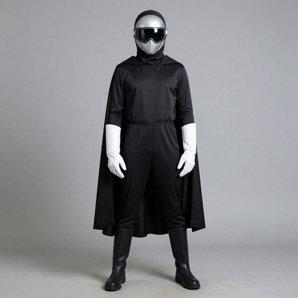 Photograph of a person in a black, long-sleeve dress, white gloves, black boots, and a black helmet with reflective visor,