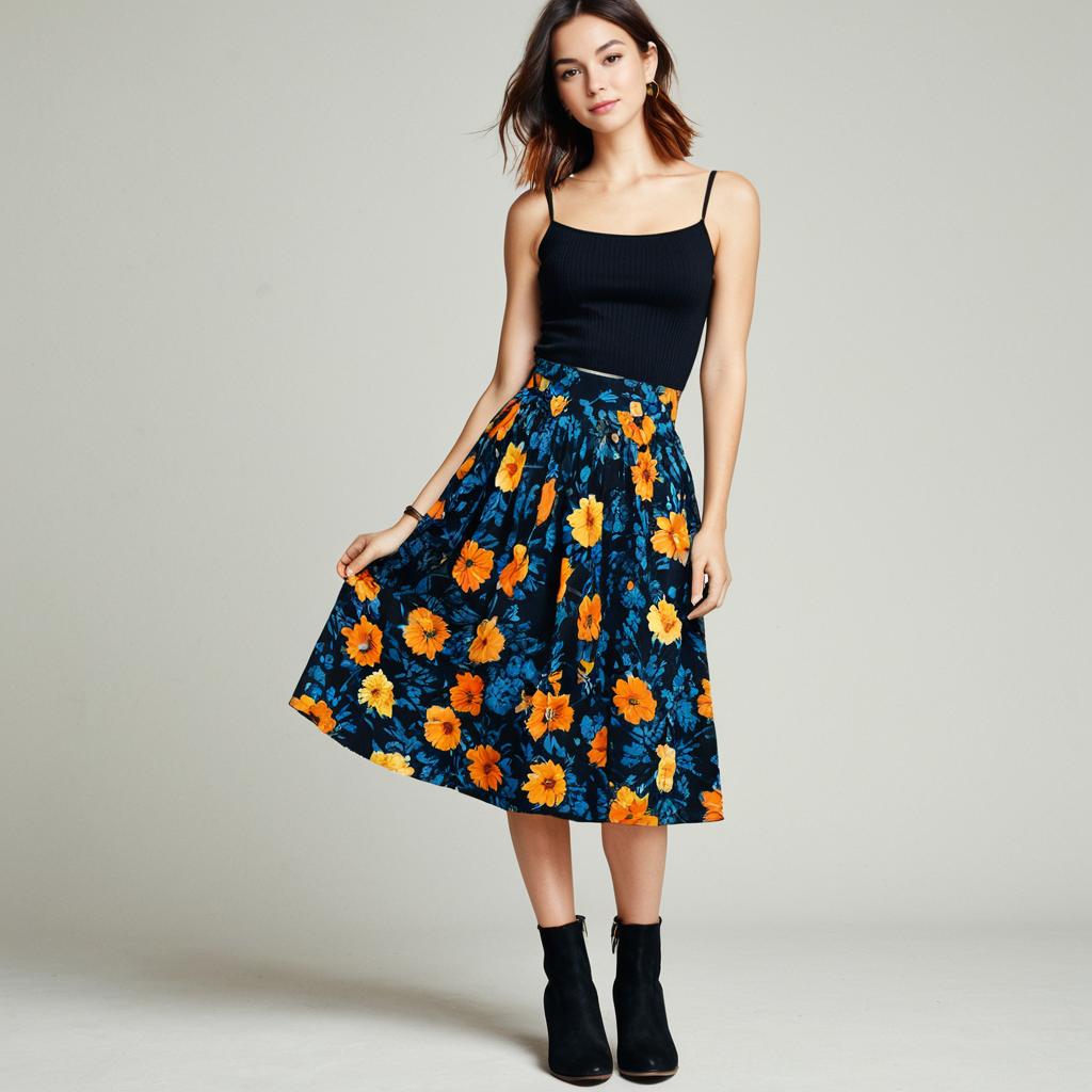 Woman, casual chic, black tank top, thin straps, scoop neckline, fitted waist, floral skirt in blue with large orange and yellow flowers, knee-length, pleated, black ankle boots with low heels, neutral studio background.