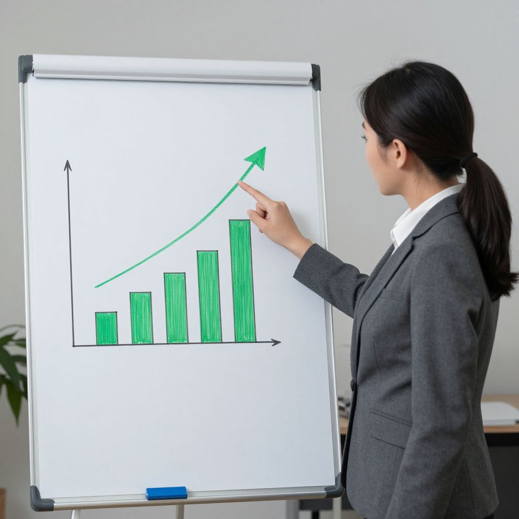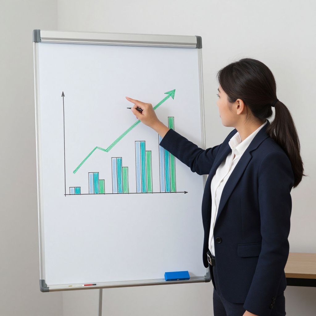 Professional woman presenting a flip chart displaying a bar graph with a green arrow indicating increasing sales growth, while pointing to the upward trend with her right hand.