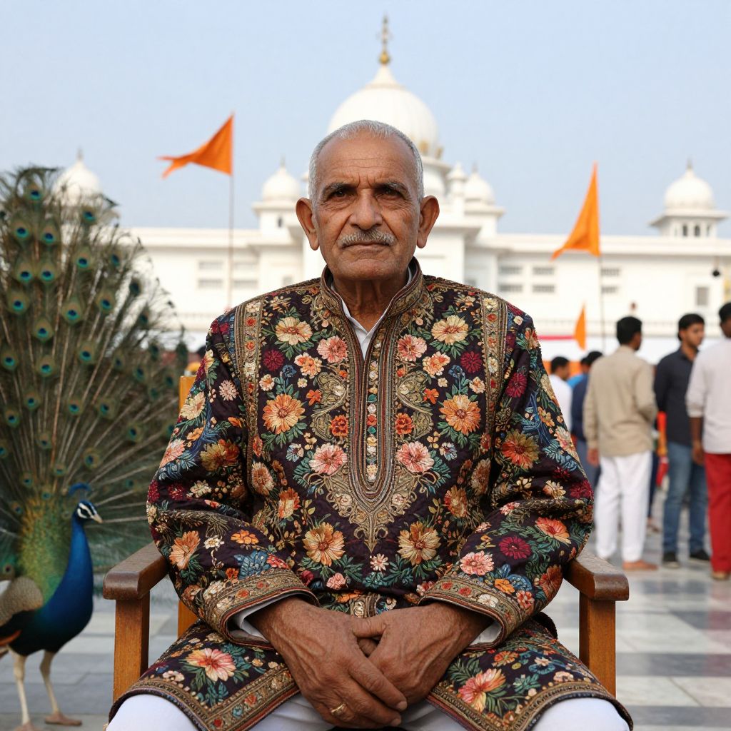 A festive portrait of an elderly man in a richly embroidered floral printed punjabi suit, wearing it as a costume for a cultural parade, sitting on a wooden chair in front of a temple in Amritsar, with peacocks and flags waving in the wind; he has a wise face with deep crow's feet and a gentle, proud gaze, symbolizing heritage and tradition.
