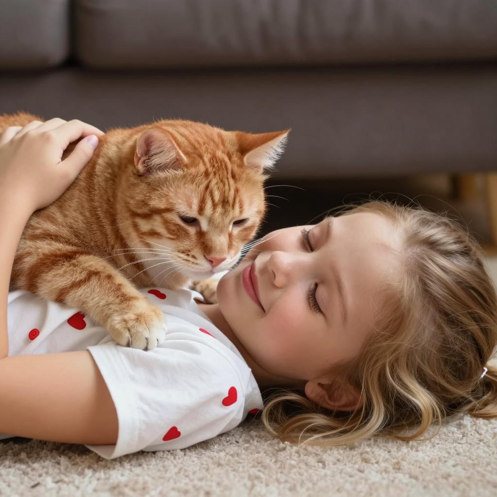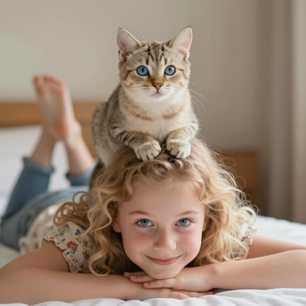 Illustration of a young girl with curly blonde hair, wearing a pink lace-trimmed dress, sitting on a bed with white and pink pillows. She has a pink flower hairclip and a soft smile. A fluffy tabby cat with green eyes lies next to her on the bed. Bright sunlight filters through a window with pink flowers in the background. The girl's left hand rests on the cat's back.