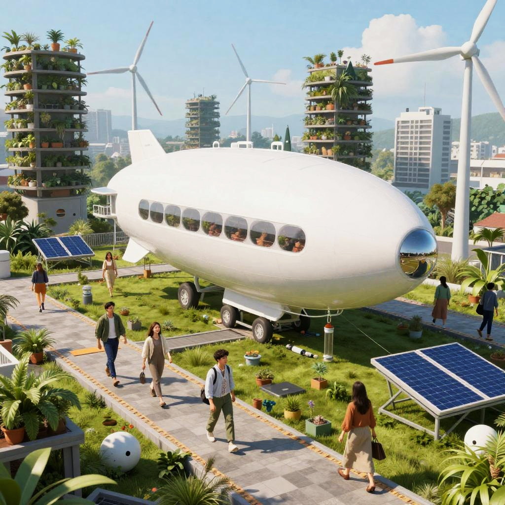 Solarpunk airship docked at a green rooftop station surrounded by vertical farms and wind turbines, bustling with people in eco-fashion, capturing a hopeful, sustainable future.