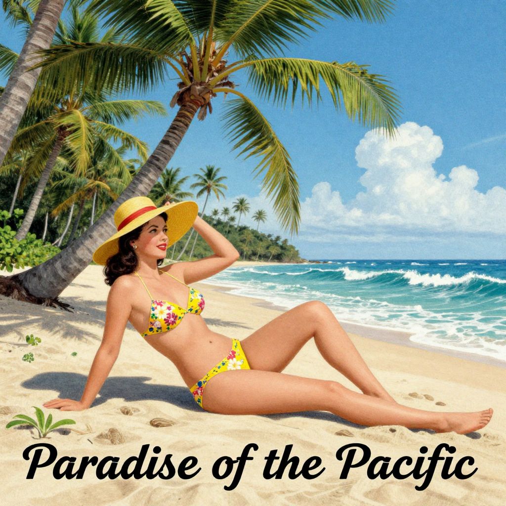 A vintage-style illustration titled \"Paradise of the Pacific\" from 1932 depicts a woman lounging on a tropical beach, adorned in a yellow floral bikini and wide-brimmed hat, surrounded by lush palm trees and vibrant ocean waves under a clear blue sky.