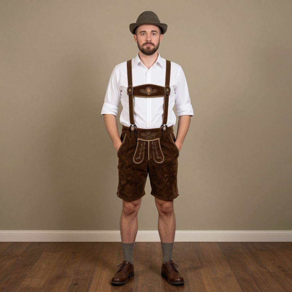 Lederhosen man costume, 1boy, male focus, solo, hat, shorts, facial hair, suspenders, beard, shirt, hands in pockets, brown footwear, full body, socks, standing, suspender shorts, parody, looking at viewer