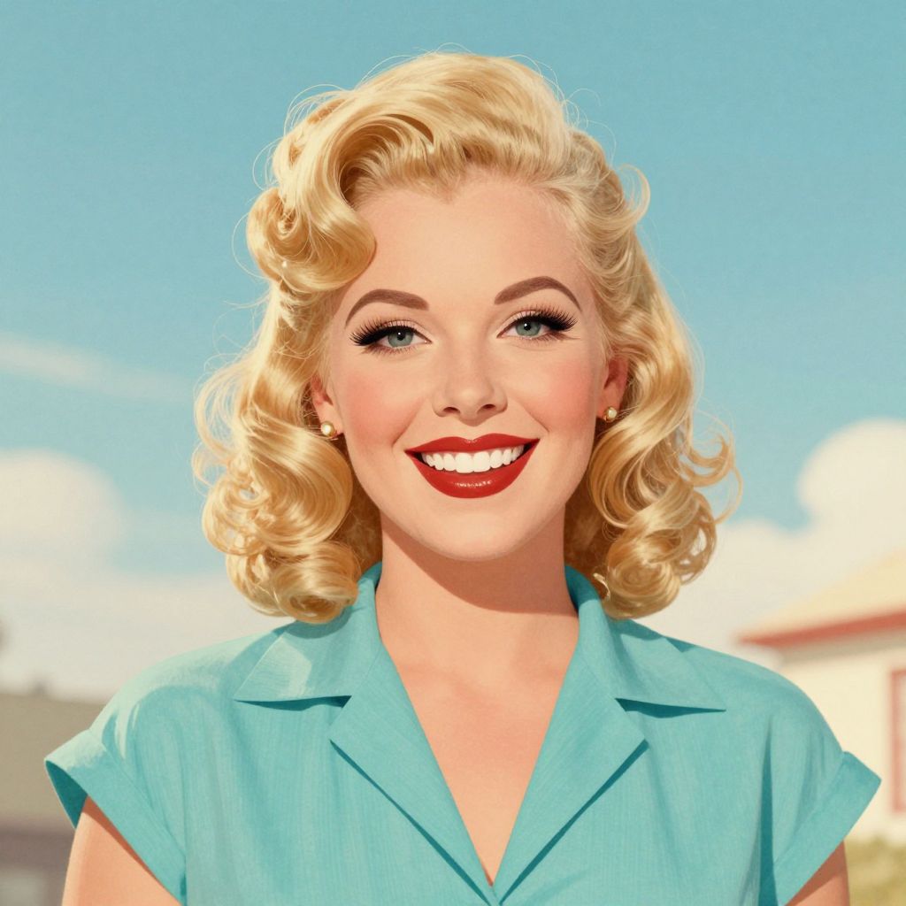 A vibrant retro illustration featuring a woman with golden curls and a radiant smile, set against a vintage-style backdrop with a clear blue sky, evoking the nostalgic charm of 1940s fashion and aesthetics.