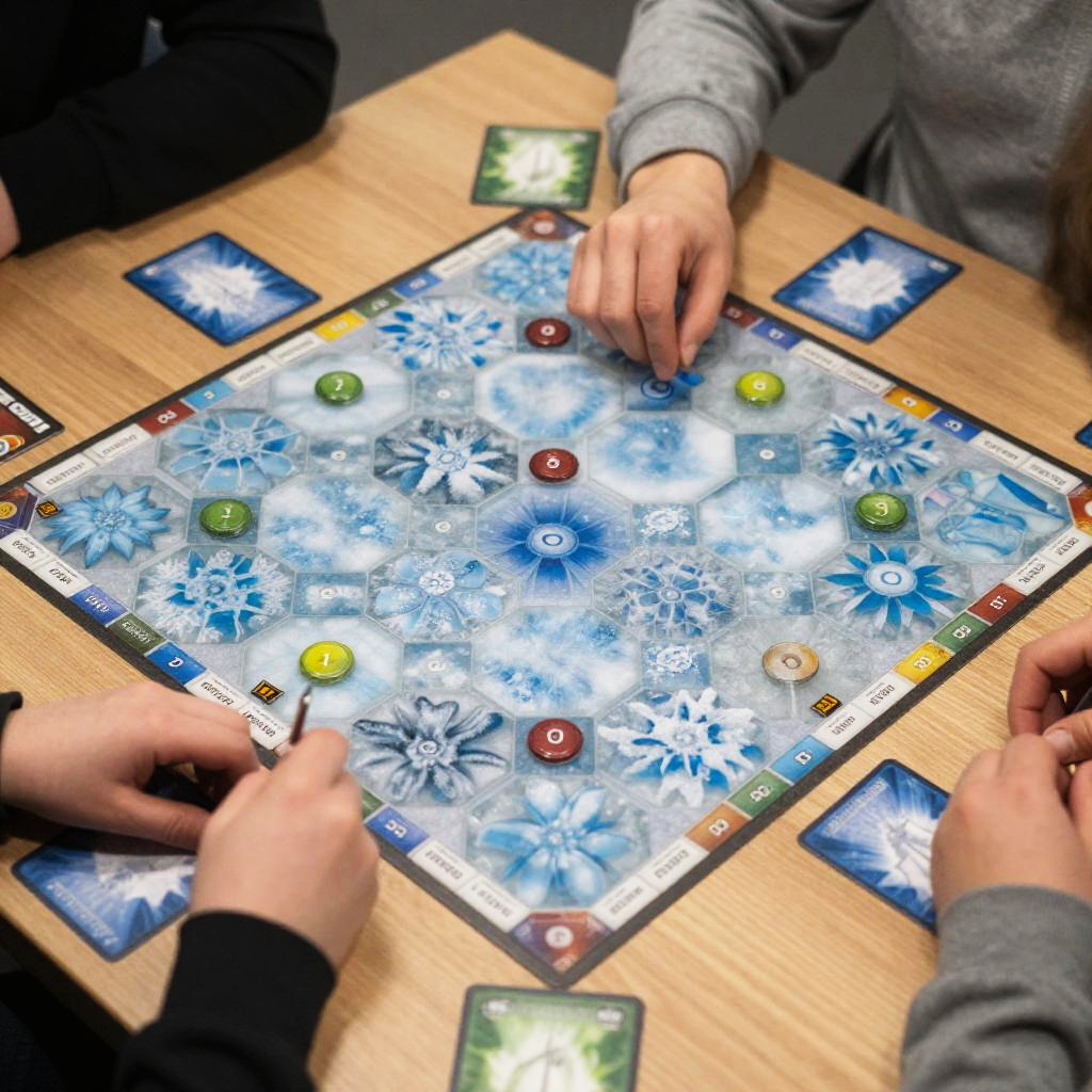 Close-up of a floe board game mid-play, with players strategizing over hexagonal ice floe tiles, vibrant cold tones, and frosty game cards on a modern wooden surface