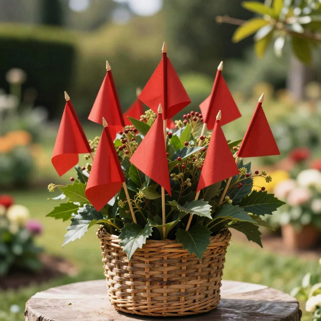 Red flag bouquet arranged elegantly in a rustic woven basket, vibrant red flags fluttering amidst lush green leaves, soft natural lighting highlighting textures, set against a blurred garden background, magical and inviting atmosphere.