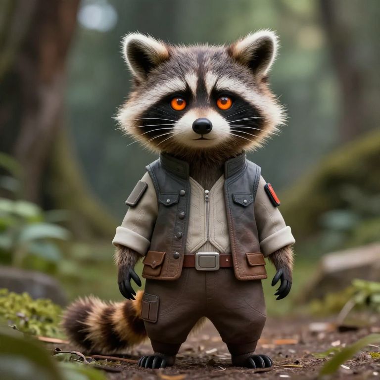 A whimsical, anthropomorphic creature with raccoon-like features and glowing orange eyes stands confidently in a Star Wars-inspired uniform, embodying the fantastical blend of nature and sci-fi adventure.