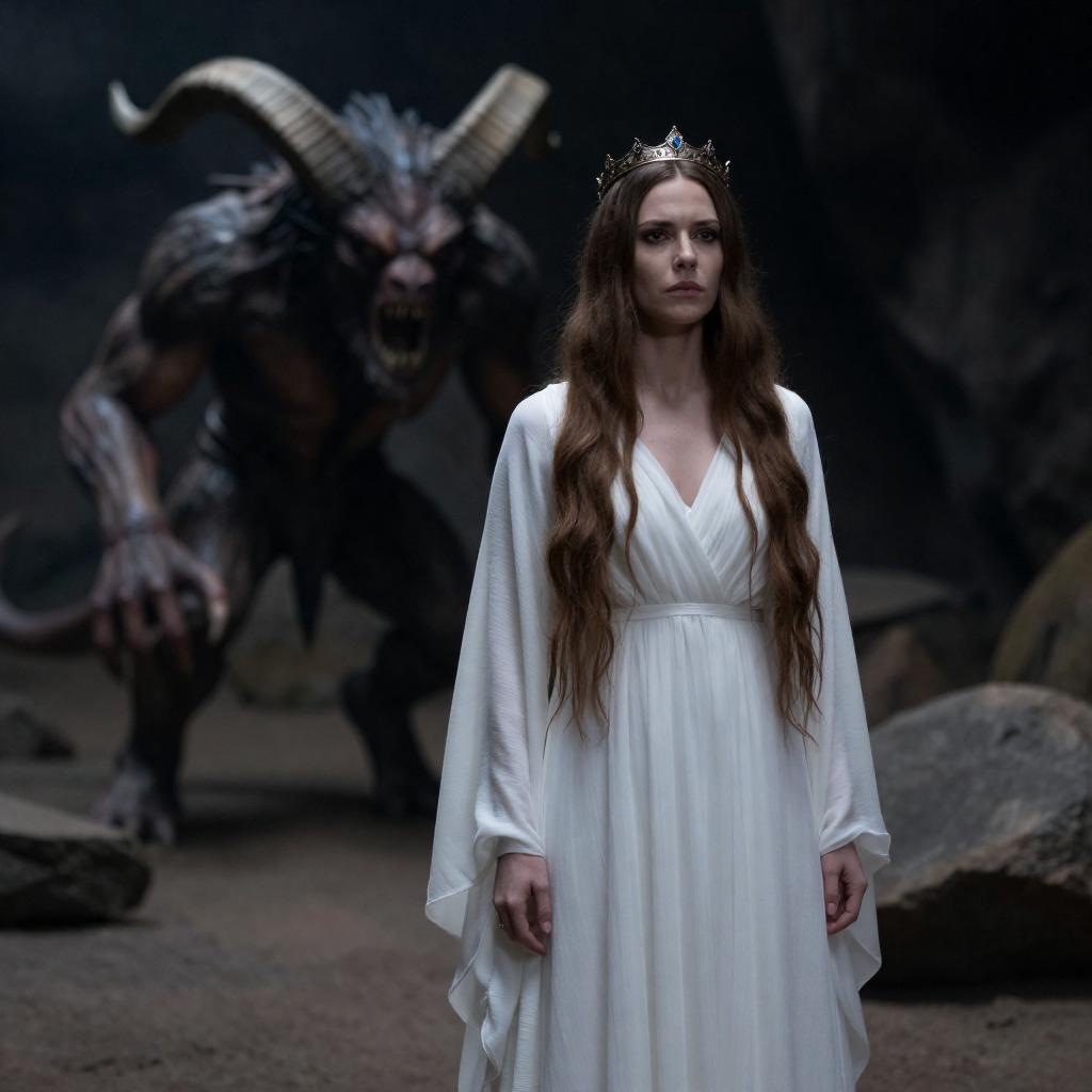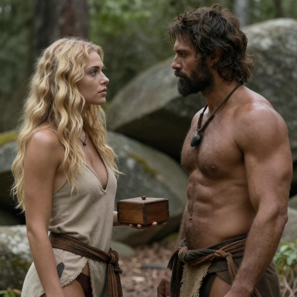Photograph of a fair-skinned woman with curly blonde hair and a flower crown, leaning close to a bearded man with brown fur on his face and large, pointed ears. Both focus intently on each other. Dense green foliage in the background. A partially visible dark-haired figure in the background. The man has a serious expression. The woman's expression is intense.