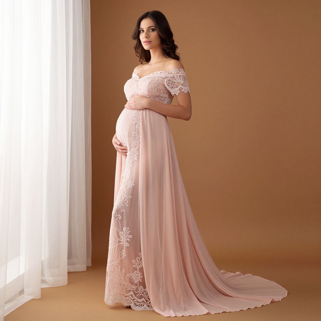 Elegant pregnant woman posing gracefully in a flowing pink maternity gown featuring off-the-shoulder sleeves and intricate lace detailing, set against a warm-toned backdrop with soft natural light streaming through sheer curtains.