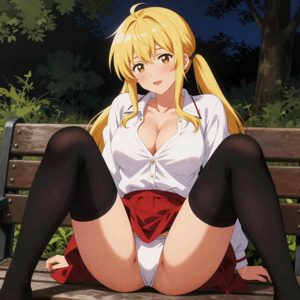 (Masterpiece, Best Quality, High Quality:1.4), professional artwork, Intricate Details, field of view, sharp focus, detailed painting, masterpiece, cinematic lighting, trending on pixiv, vivid lighting, vibrant colors, by Nagasawa Rosetsu, retro artstyle, rococo, Saeki kaori, (sitting on the bench, spread legs:1.3), evening, (full body shot:1.1), blonde hair, long hair, ponytail, lipstick, makeup, ultra detail hair, ultra detail face, perfect eyes, perfect face, earring, brown eyes, Looking at Viewer, (flirting, blush, smiling:1.15), school_uniform, black thighhighs, red skirt, white shirt, (white panties:1.15), pantsu shot, (Large Breasts:1.2), Cleavage, big ass