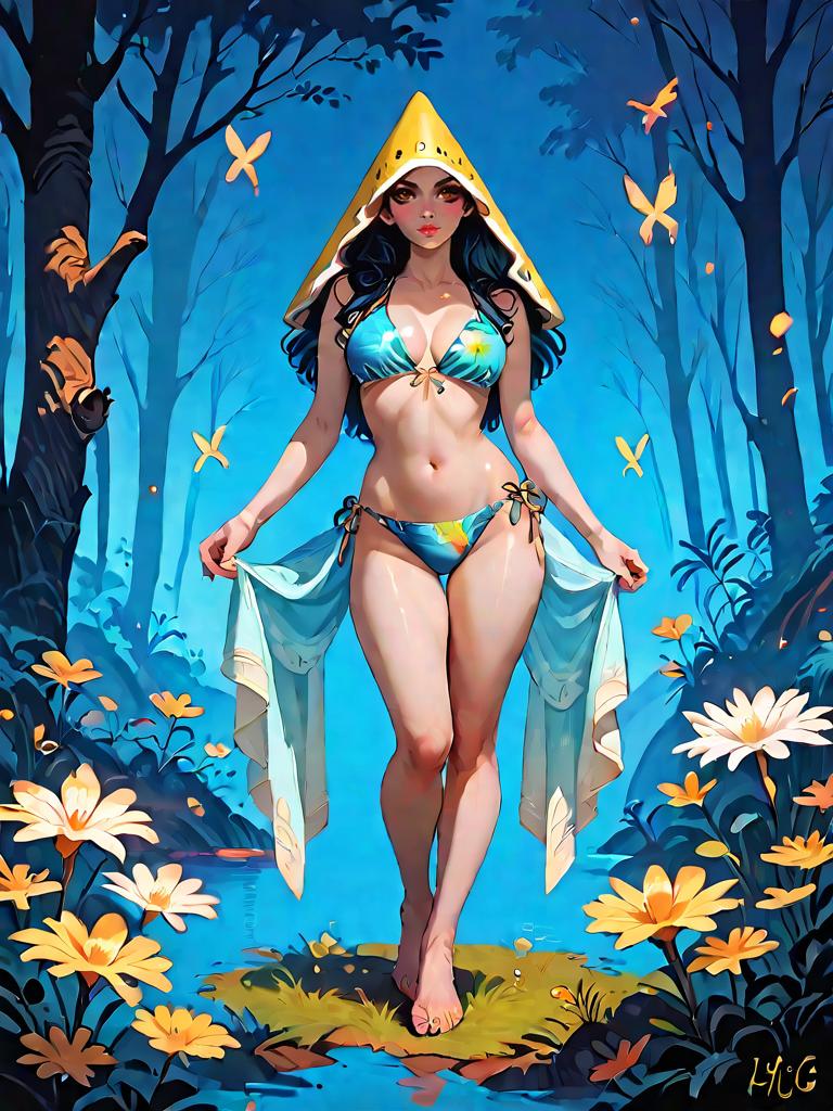 Woman in Tropical Bikini in Dark Fantasy Forest