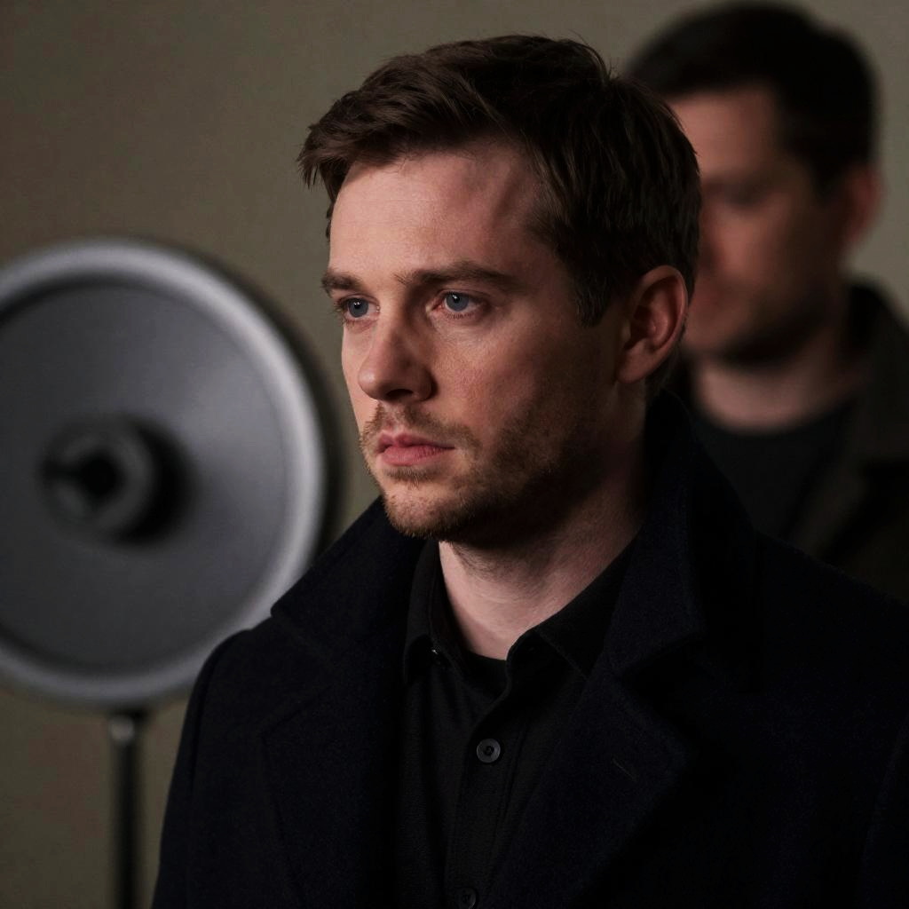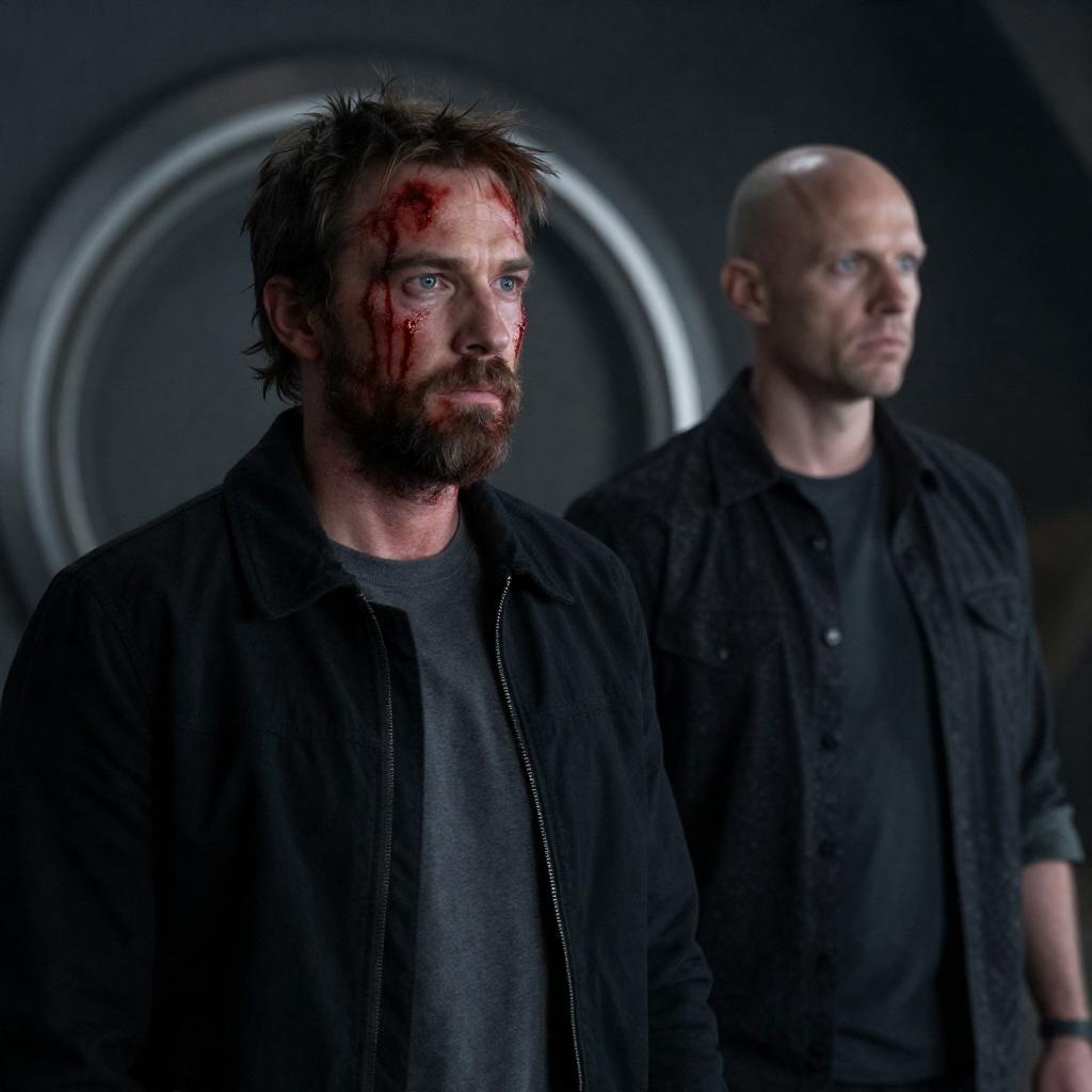 Photograph of two men in a dark, smoky landscape. The man on the right stands tall, looking down at the kneeling man on the left. Both wear dirty, dark coats. Background features charred, broken wooden structures. Kneeling man has a slightly open mouth, intense expression. Standing man has a neutral expression. Dim, yellow-orange light from the background. One bird near the kneeling man's feet.
