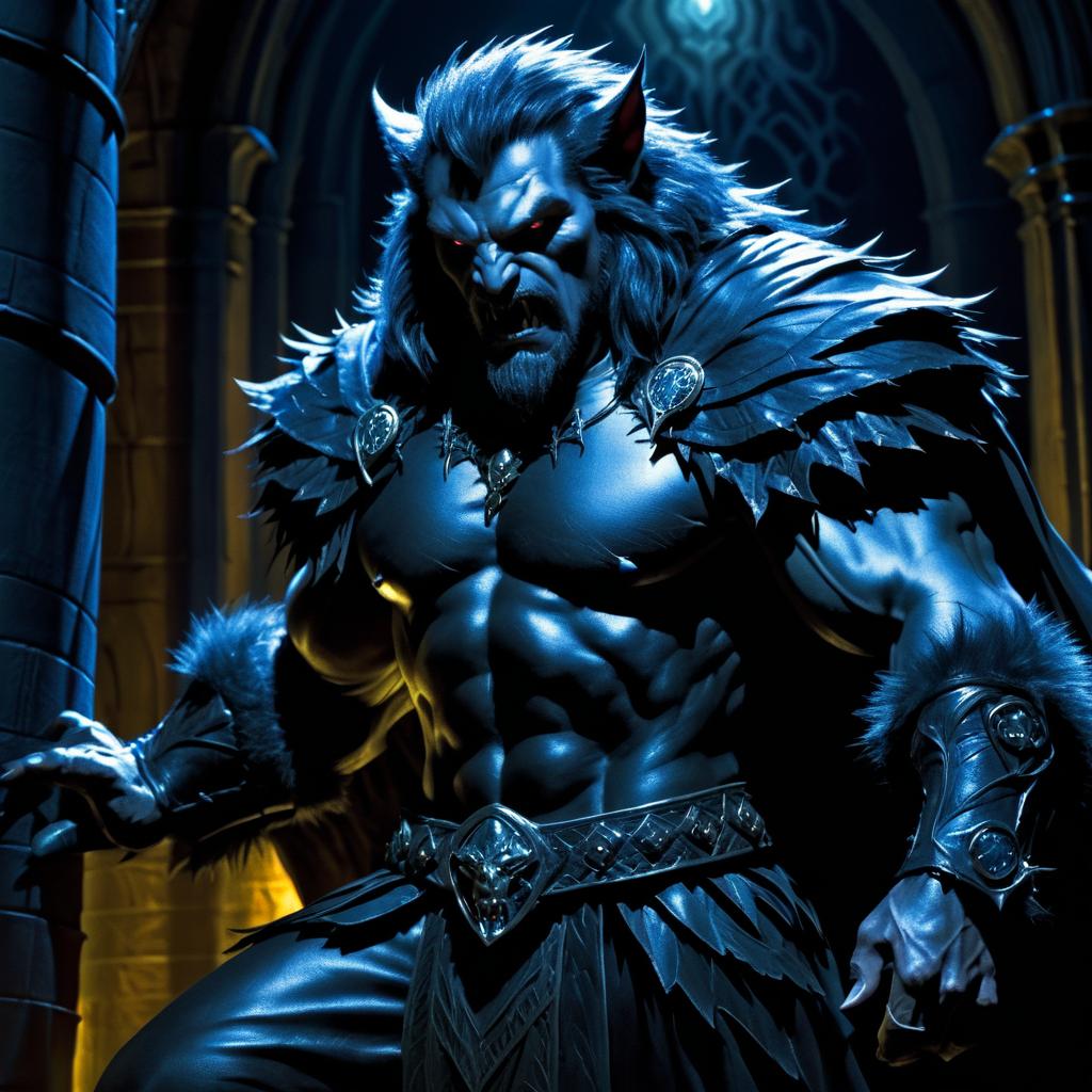 Highly detailed fantasy illustration of a muscular male werewolf warrior dressed in dark, ornate armor with fur accents. The figure has blue skin, sharp wolf-like features, glowing red eyes, and is set against an ancient stone archway with a large full moon in the background. Cinematic lighting highlights his intimidating presence.
