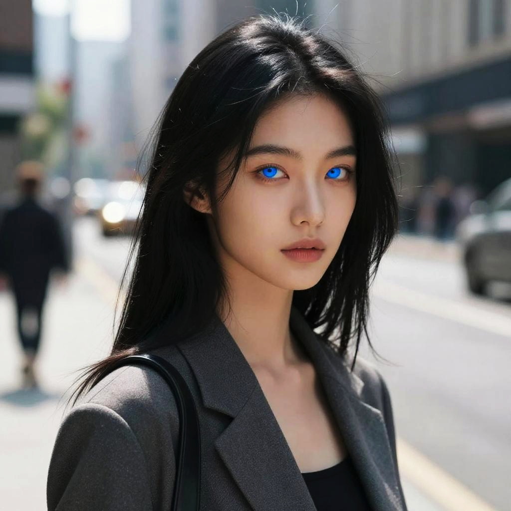 Digital portrait of an East Asian woman with long black hair, striking blue eyes, wearing a grey blazer, standing on a sunlit urban street.
