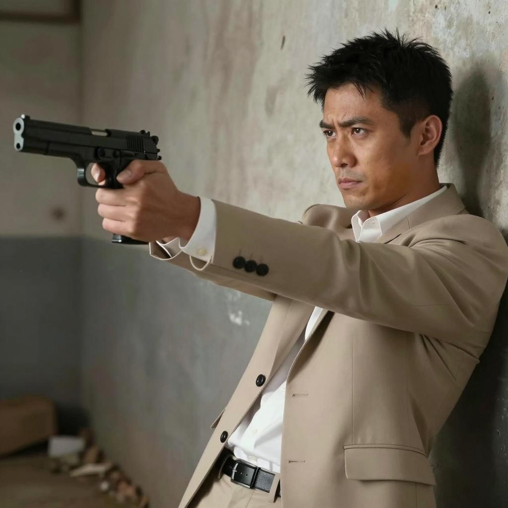 Man with blood-covered face and neck, dark hair, brown eyes, wearing a jacket, looking intently to the side. Background includes blurred windows and beige walls. Blood streaks across his face and neck, partially covering his jacket.