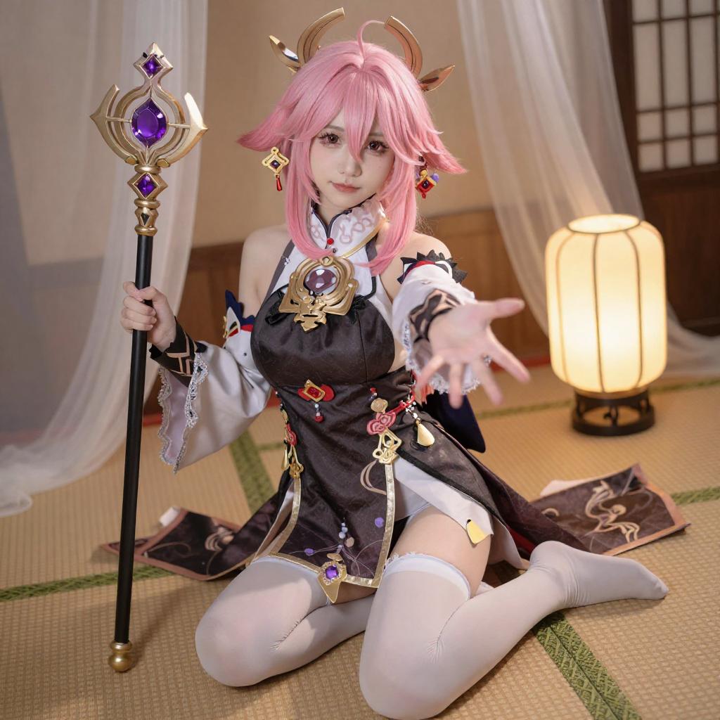 Digital artwork of a pink-haired anime girl with horn-like hair accessories, wearing a black and gold ornate dress, white thigh-high stockings, and holding a purple gem-encrusted staff. She sits on a tatami mat, extending her right arm towards the viewer. A warm, glowing lantern and draped white fabric are in the background.