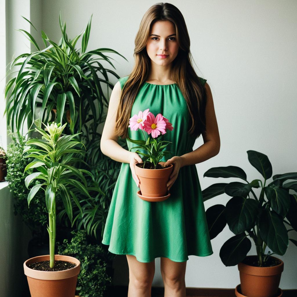 Portrait of a young woman with long brown hair wearing a sleeveless green dress, standing indoors surrounded by various green potted plants. She is holding a terracotta pot with a pink flower and looking at the camera with a neutral expression.