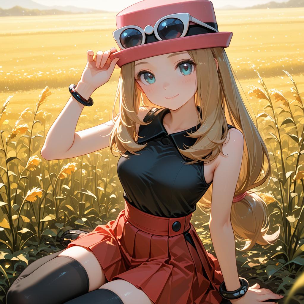 Masterpiece, best quality, highres, blue eyes, serena \(pokemon\), 1girl, solo, thighhighs, long hair, hat, jewelry, bracelet, black thighhighs, collared shirt, pleated skirt, red skirt, sleeveless, high-waist skirt, sleeveless shirt, eyelashes, pink headwear, black shirt, eyewear on headwear, upper body, field, smile, closed mouth
