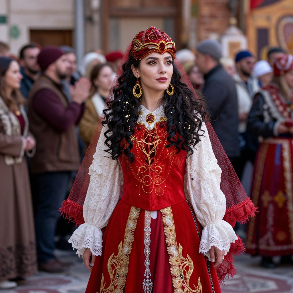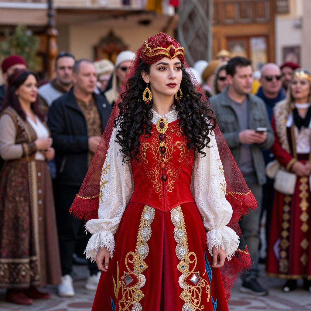 Radiating strength and grace, the Turkish warrior woman stands amidst a bustling crowd, her flowing red cloak and ornate jewelry symbolizing both cultural heritage and the timeless spirit of resilience, while the soft whispers of history and the warmth of tradition linger in the air.