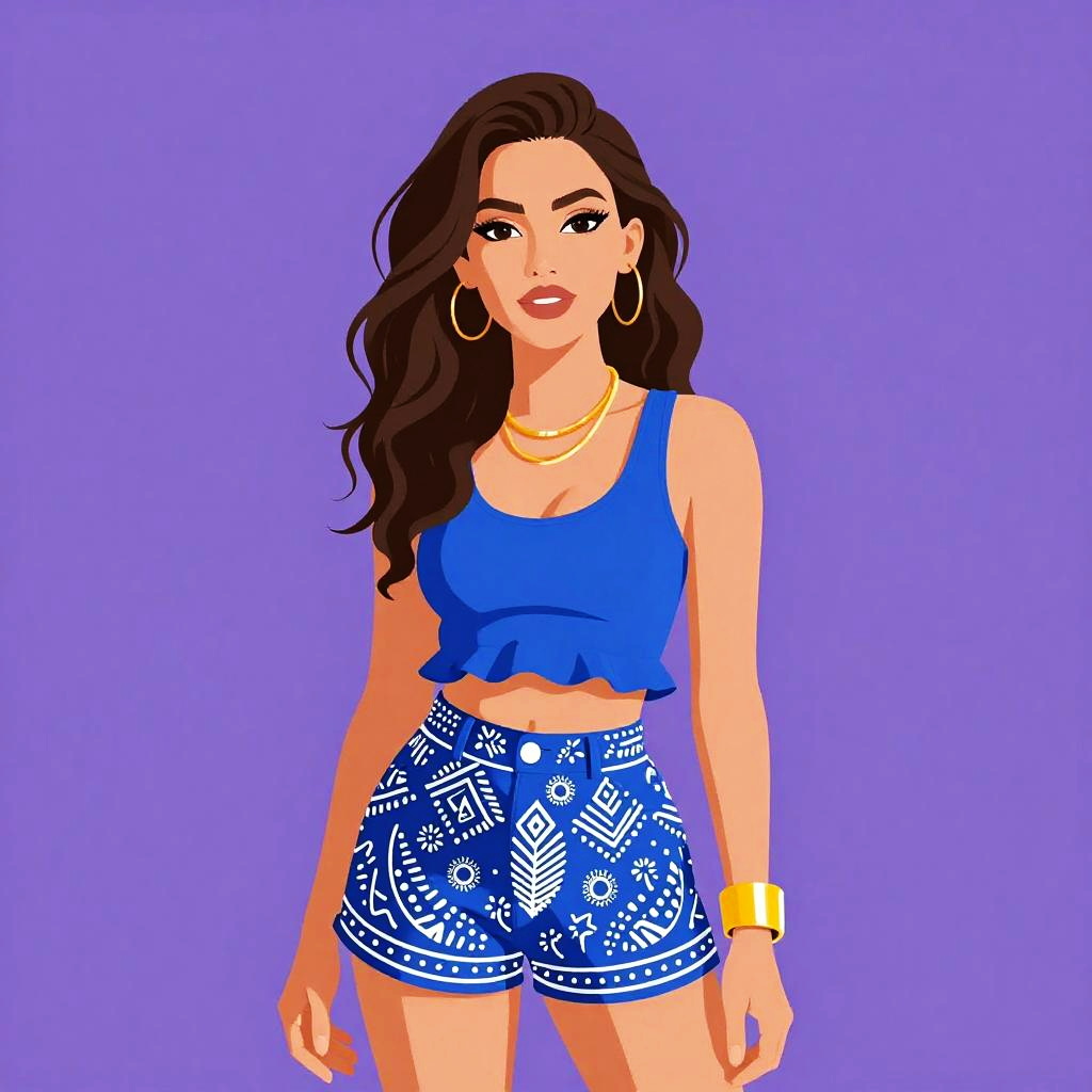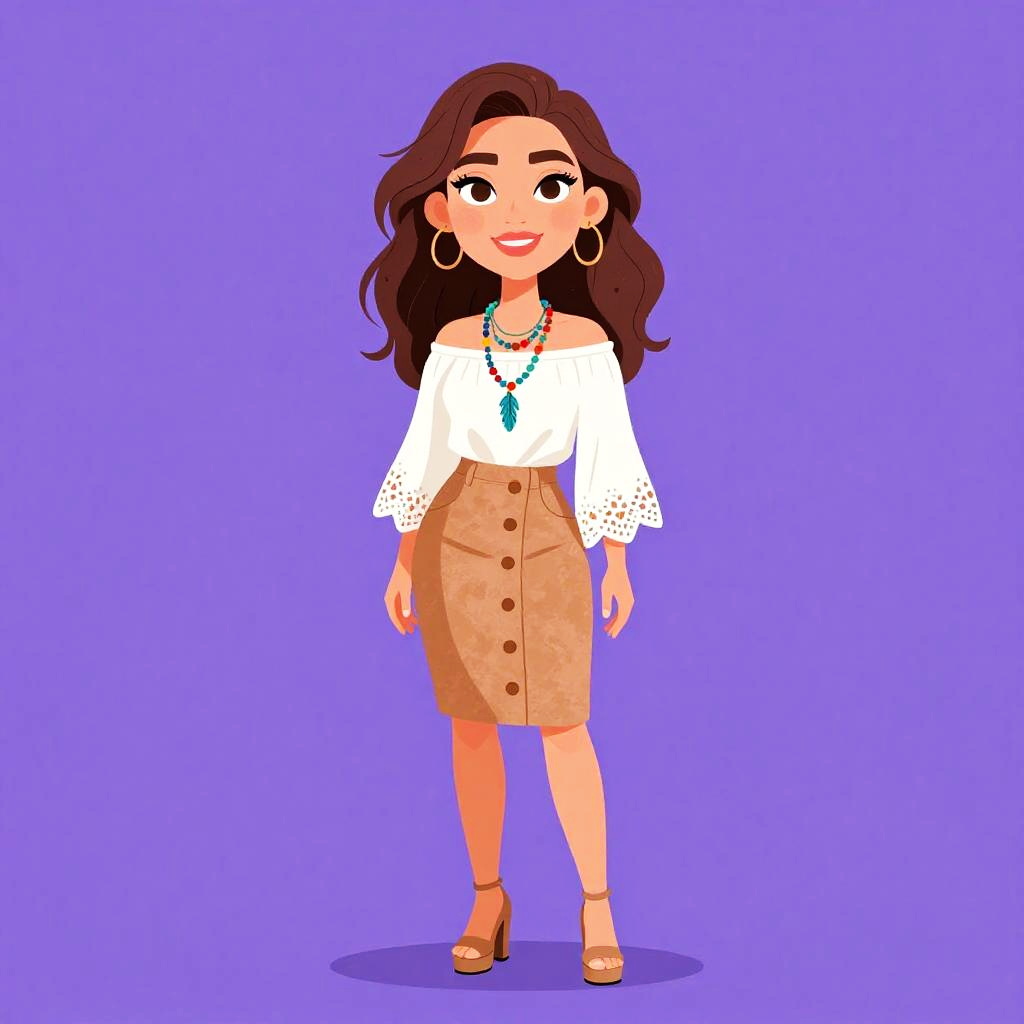 Woman with pretty face and pretty hair. smiling Woman, bohemian, off-shoulder cropped lace top in ivory with ruffle detailing, long fitted paisley patterned skirt in a mix of purples, pinks, greens, and blues, ankle-length with a slight flare, layered necklaces, thin bangle bracelets. --sref 1467