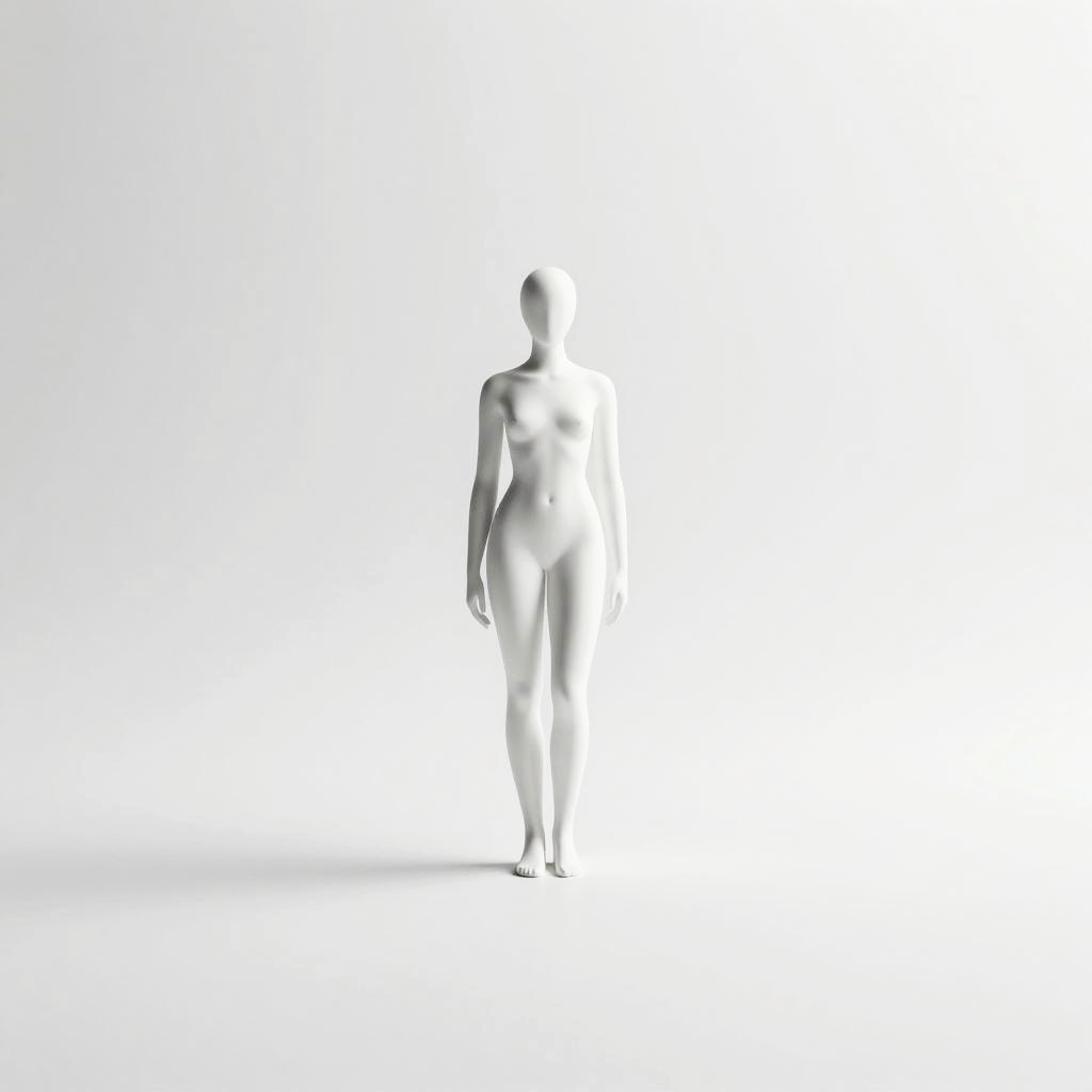 White void background, minimalist abstract scene with a solitary futuristic statue standing in the center, soft shadows and smooth gradients, high resolution, subtle lighting creating a serene and endless space atmosphere.