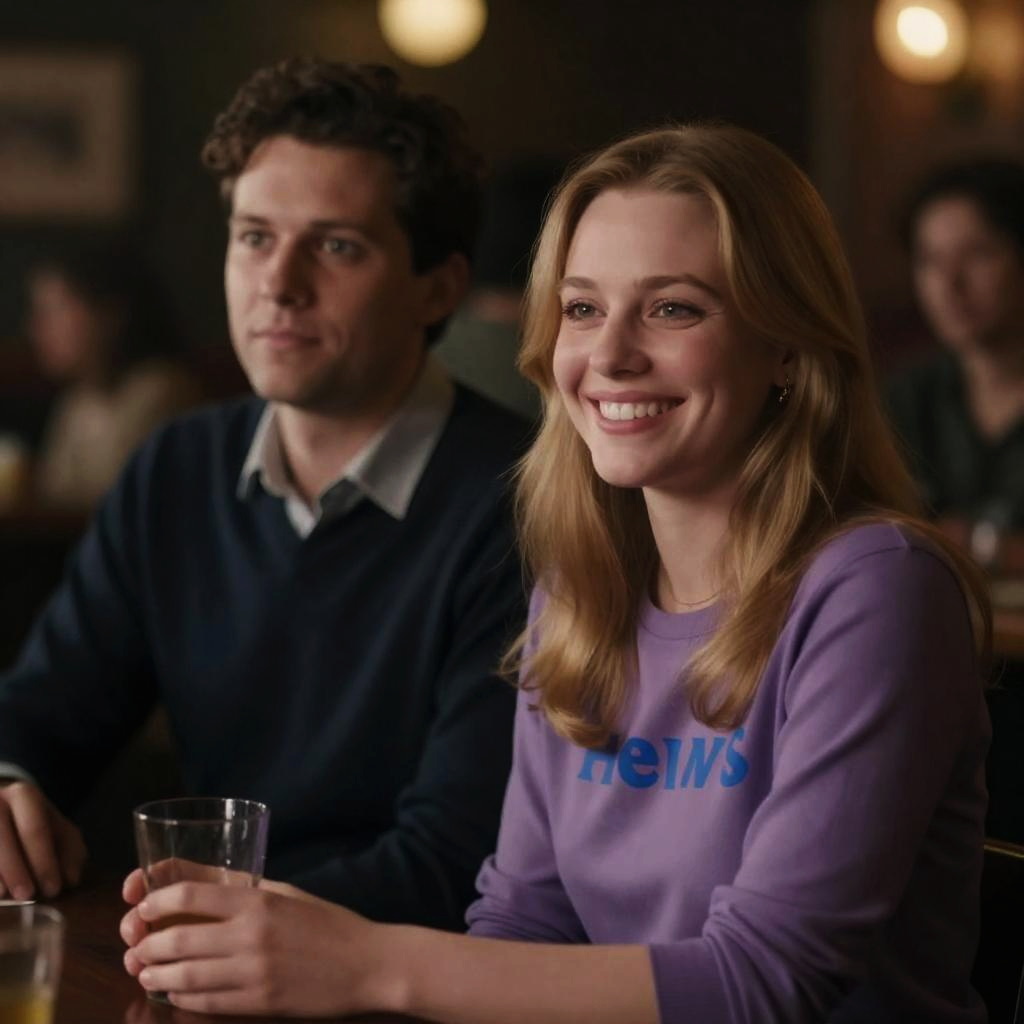Photograph of a man and woman in a dimly lit bar. The man with dark hair, light skin, wearing a dark sweater over a collared shirt, looks to the side with a neutral expression. The woman with blonde hair, light skin, wearing a purple long-sleeve shirt with blue letters, smiles brightly. She holds a glass in her right hand. Several blurred people in the background. Soft, warm lighting. The woman is slightly in front of the man. Both seated.