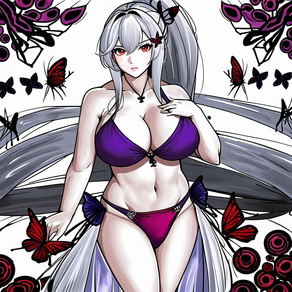 Digital anime-style illustration of a female character from Azur Lane with long grey hair in a ponytail, red eyes, and a butterfly hair ornament. She is wearing a purple bikini with butterfly decorations, displaying cleavage and exposed thighs and navel. The background features stylized butterflies in red, black, and purple.