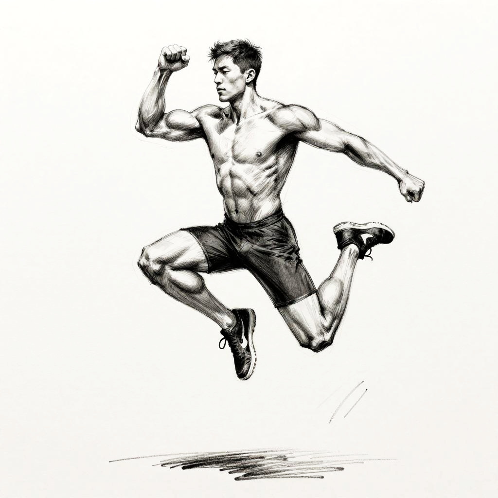 Dynamic jumping poses drawing of a male athlete in mid-air, muscles tensed, energetic motion captured with expressive lines and shadows, sketch style with anatomical accuracy, emphasizing sense of movement and height against a minimalist background.