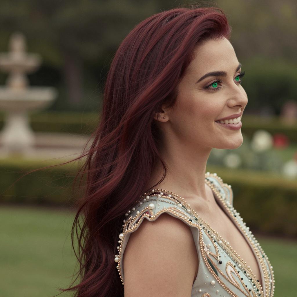 Passion Depth of field, tilt shift, beautiful smiling woman in a garden, wearing an elegant dress, close-up could be used for profile, dark red hair is long and flowing, eyes are emerald green, volumetric lighting, Bokeh background, Intricate details, color grading, film grain, hyperrealistic,