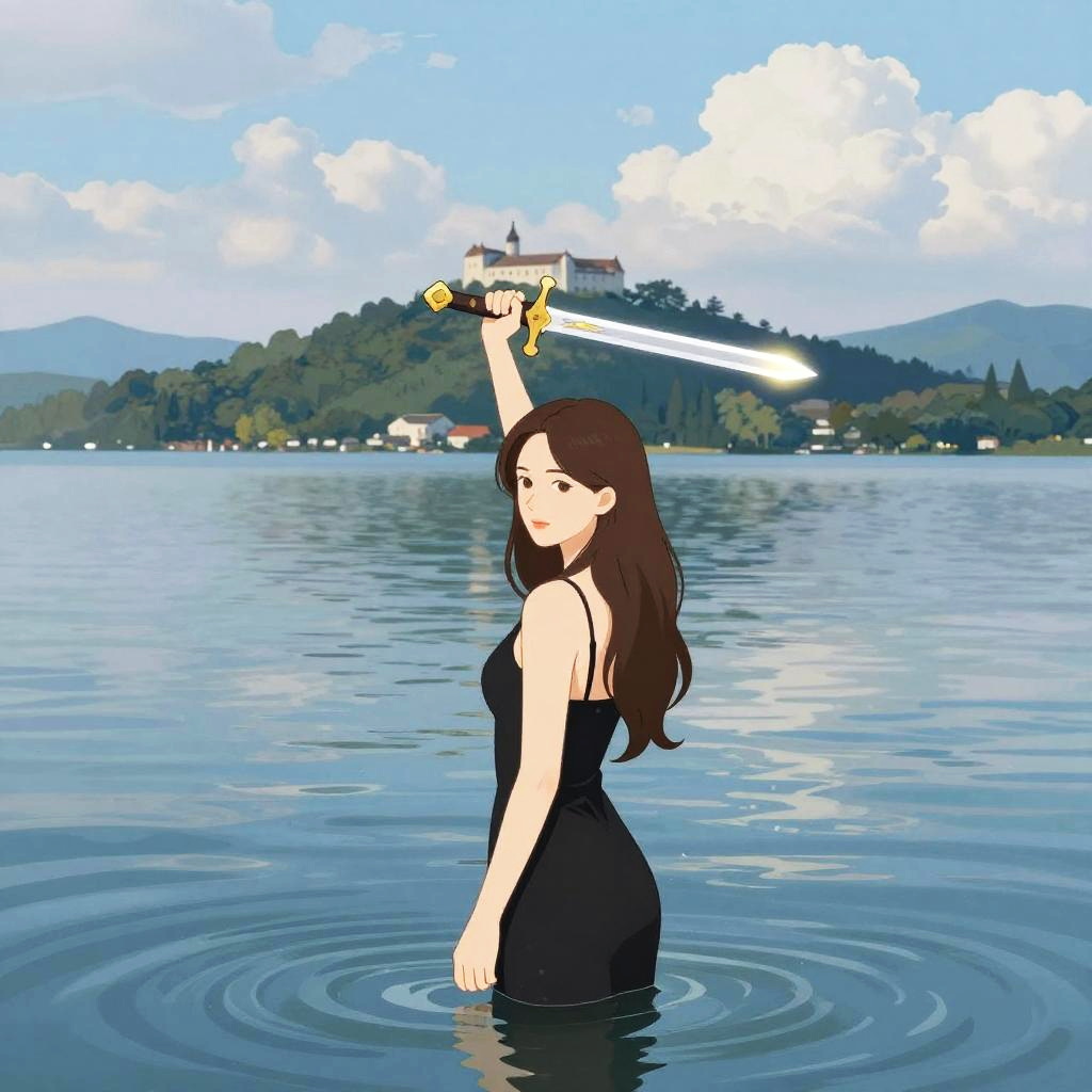 Digital illustration of a young woman with long brown hair, wearing a black sleeveless dress, standing in a calm lake, holding a sword above her head with her right hand. The sword has a white blade and a yellow hilt. She gazes over her shoulder with a serious expression. The background features a serene lakeside village with houses and a distant hill with a church. The sky is blue with fluffy white clouds. Ripples from the woman's standing position spread out in the water. The overall style is semi-realistic with vibrant colors and clean lines.