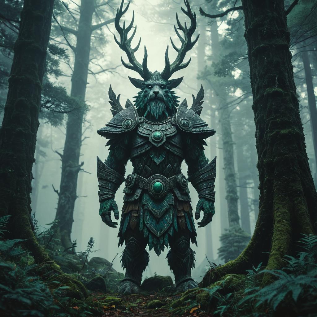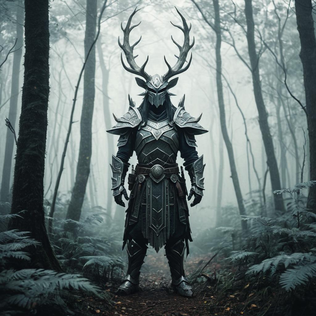 A surreal fantasy depiction of a mystic forest guardian clad in ornate dark armor adorned with leaf motifs and large antler-like horns on the helmet, standing in an enchanted, moonlit forest with dense trees and ferns under cinematic lighting.