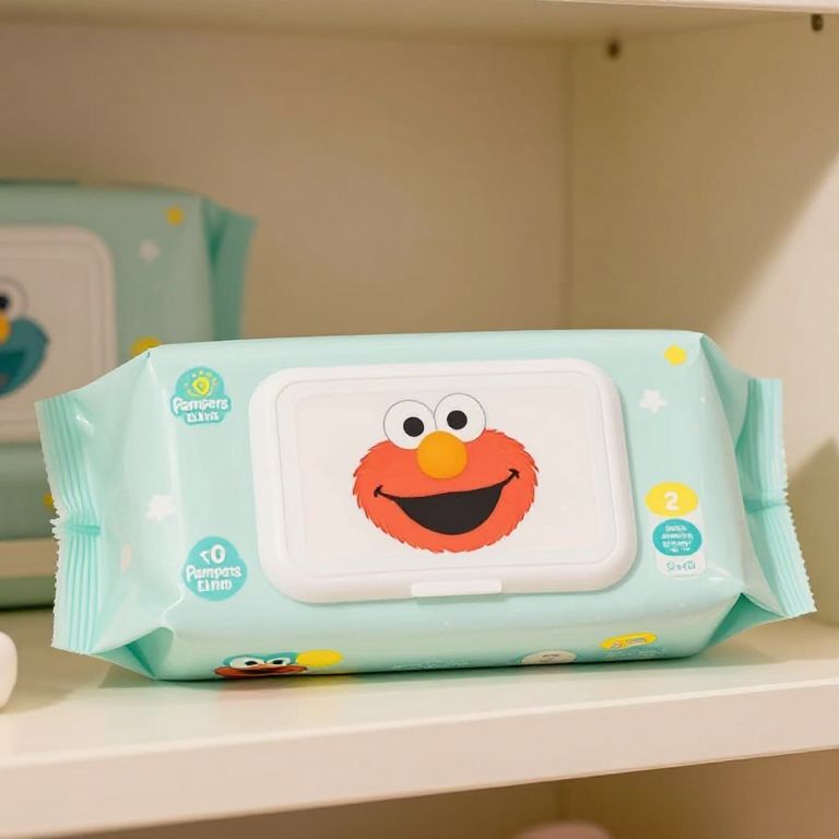 Pampers Elmo branding on baby wipes pack, cute Elmo character with gentle expression, pastel color palette, clean and soft packaging design, nursery shelf setting, warm cozy light