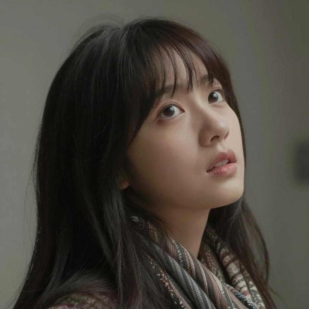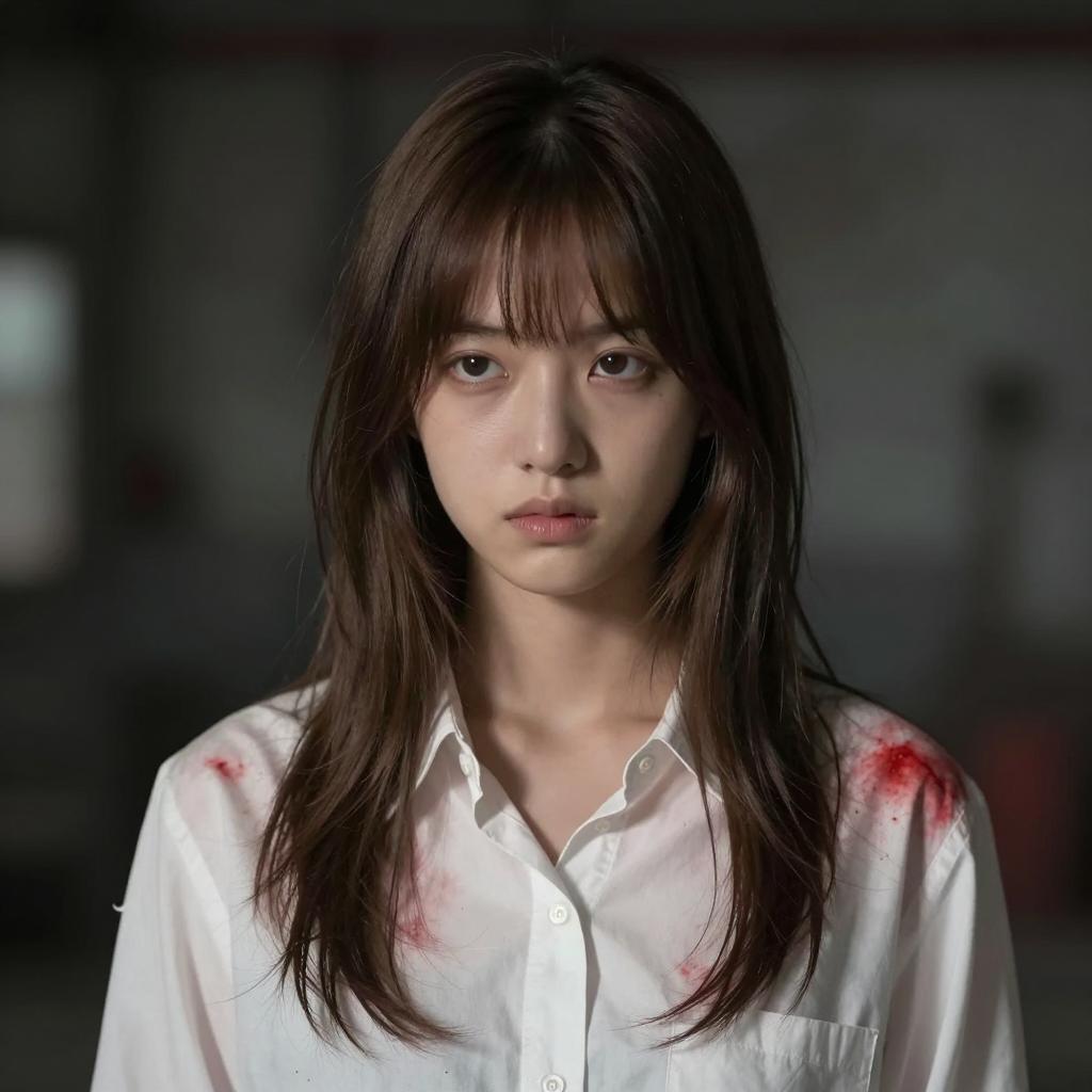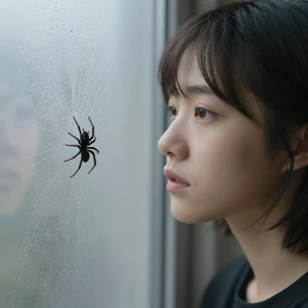 A young woman with short dark hair, gazing intently at a black spider on a foggy window. She has a neutral expression, light skin, and wears a dark-colored top. The background is blurry with vertical window frames. The spider is small, positioned to the left of the woman's face.