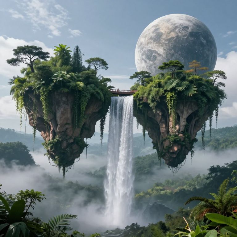 Suspended islands, lush with greenery and tethered by cascading vines, bridge two colossal moons above a misty valley, forming a surreal landscape where gravity-defying waterfalls cascade from the sky.