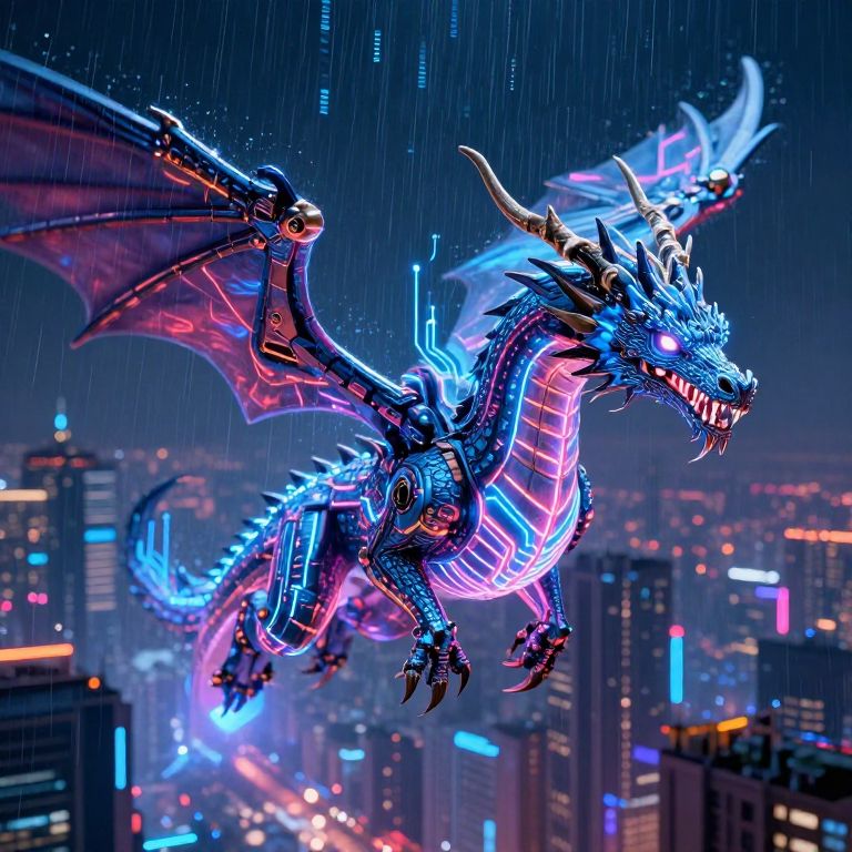 Ai_dragon soaring above a futuristic cyber cityscape at night, glowing neon circuits running through its metallic scales, sharp eyes scanning the horizon, digital rain falling, highly detailed, vibrant colors