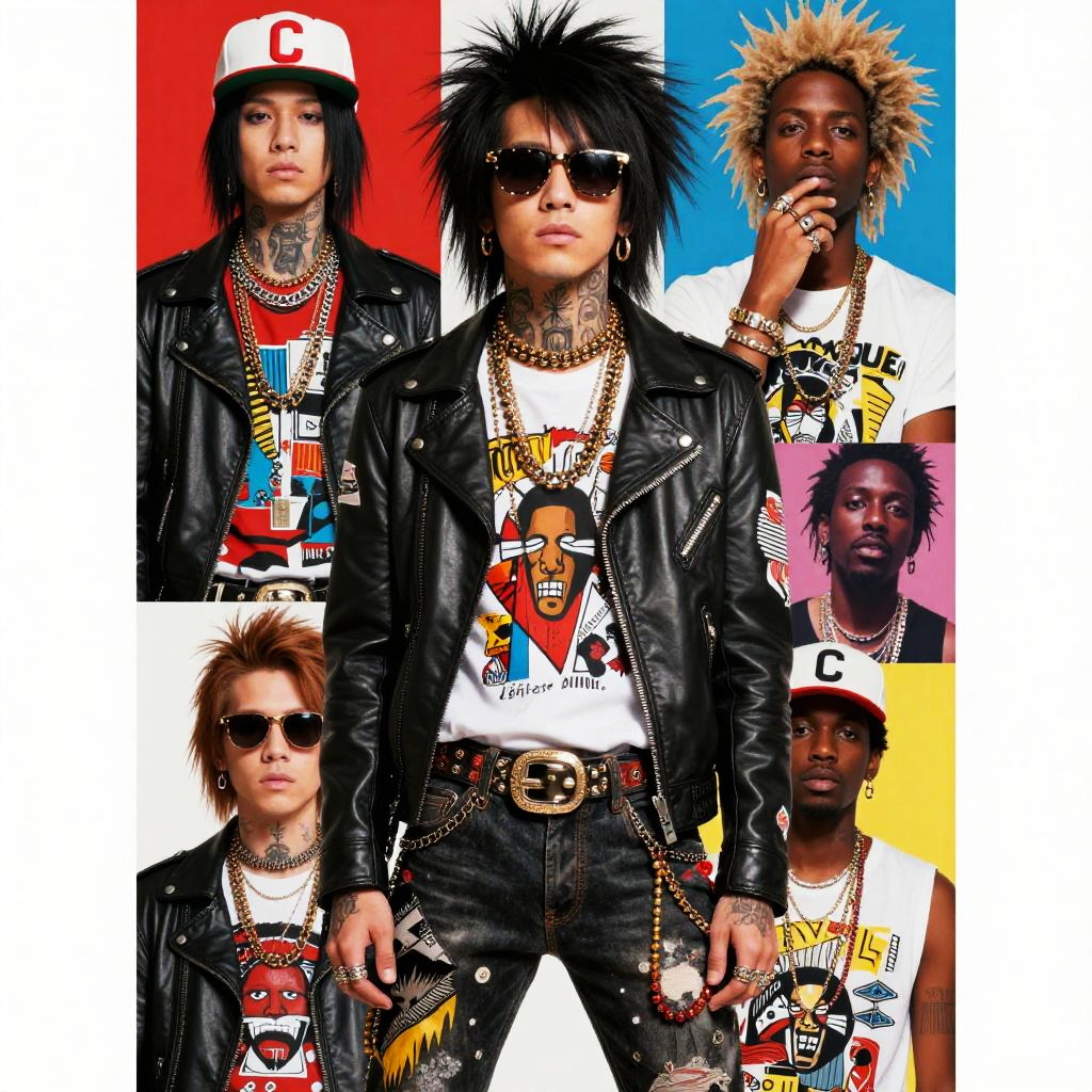 Realistic photo.Poster blending the collage art of Jean-Michel Basquiat with visual kei aesthetics, surreal imagery and bold juxtapositions, flamboyant Japanese fashion, thought-provoking, vibrant and dynamic, contemporary art style. realistic photo