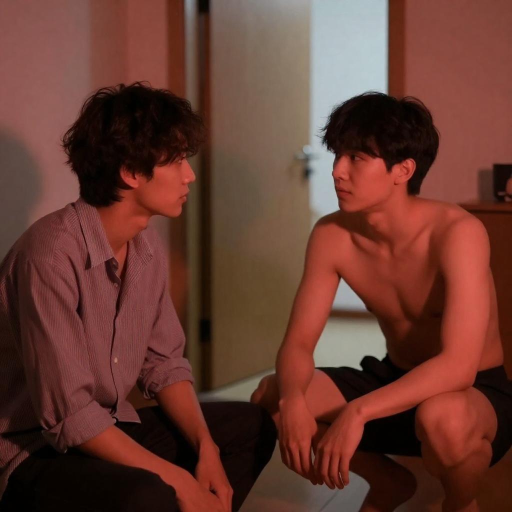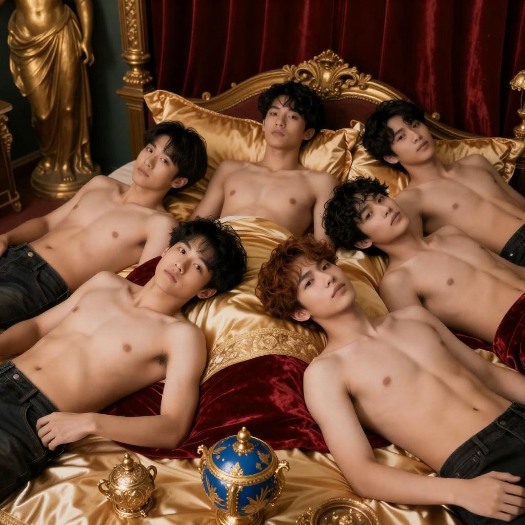 Photograph of five shirtless individuals with varying hair colors and styles, lying on a luxurious bed with golden satin sheets and deep red velvet blankets. They are surrounded by ornate golden and blue objects, including a large golden statue. The background features rich red curtains. The group appears relaxed, with some gazing at the camera and others looking away.