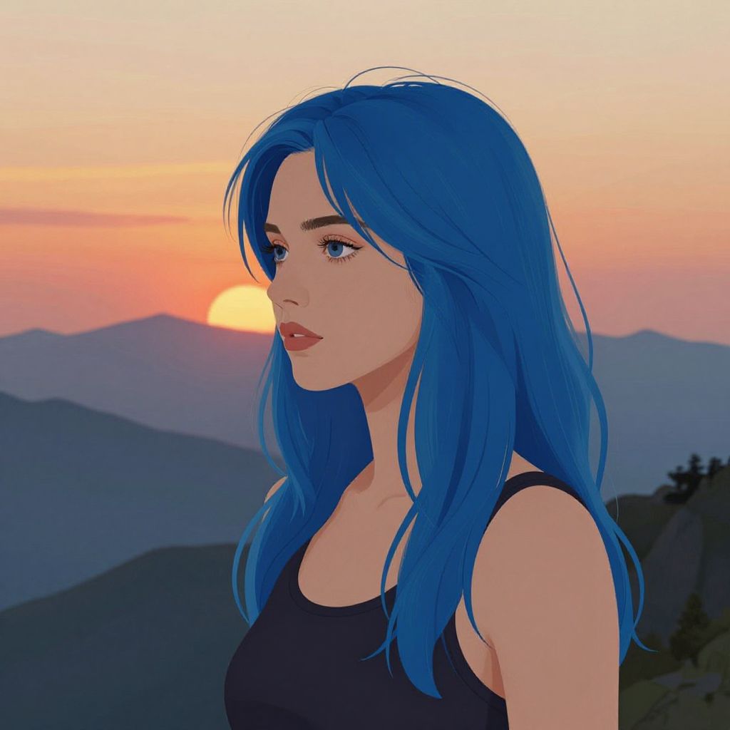 Blue-Haired Woman at Mountain Sunset