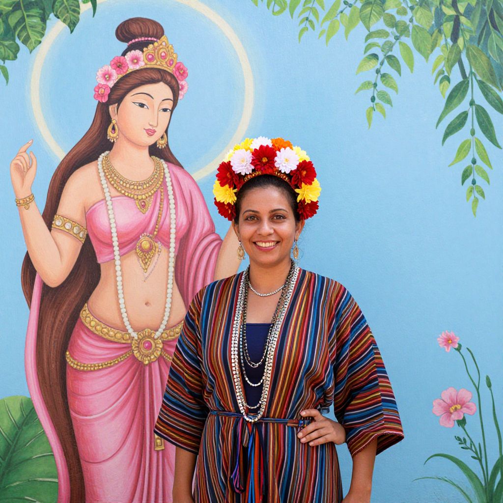 Woman wearing vibrant striped robes, layered necklaces, and a radiant floral headdress smiles brightly while posing in front of a mural depicting a serene pink-clad goddess with flowing hair and a floral crown, set against a tranquil blue backdrop with green foliage and blooming flowers.