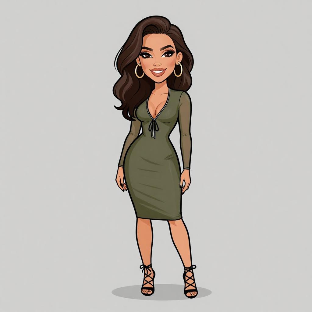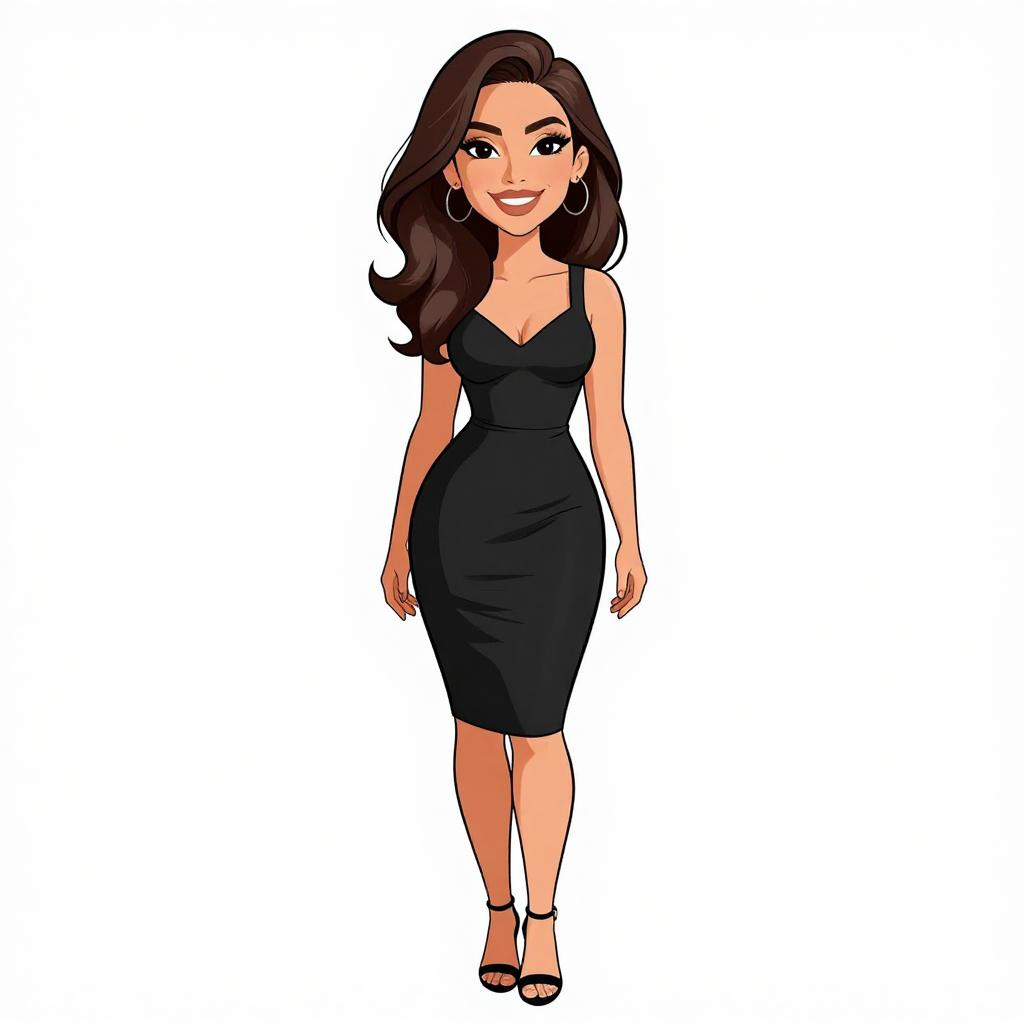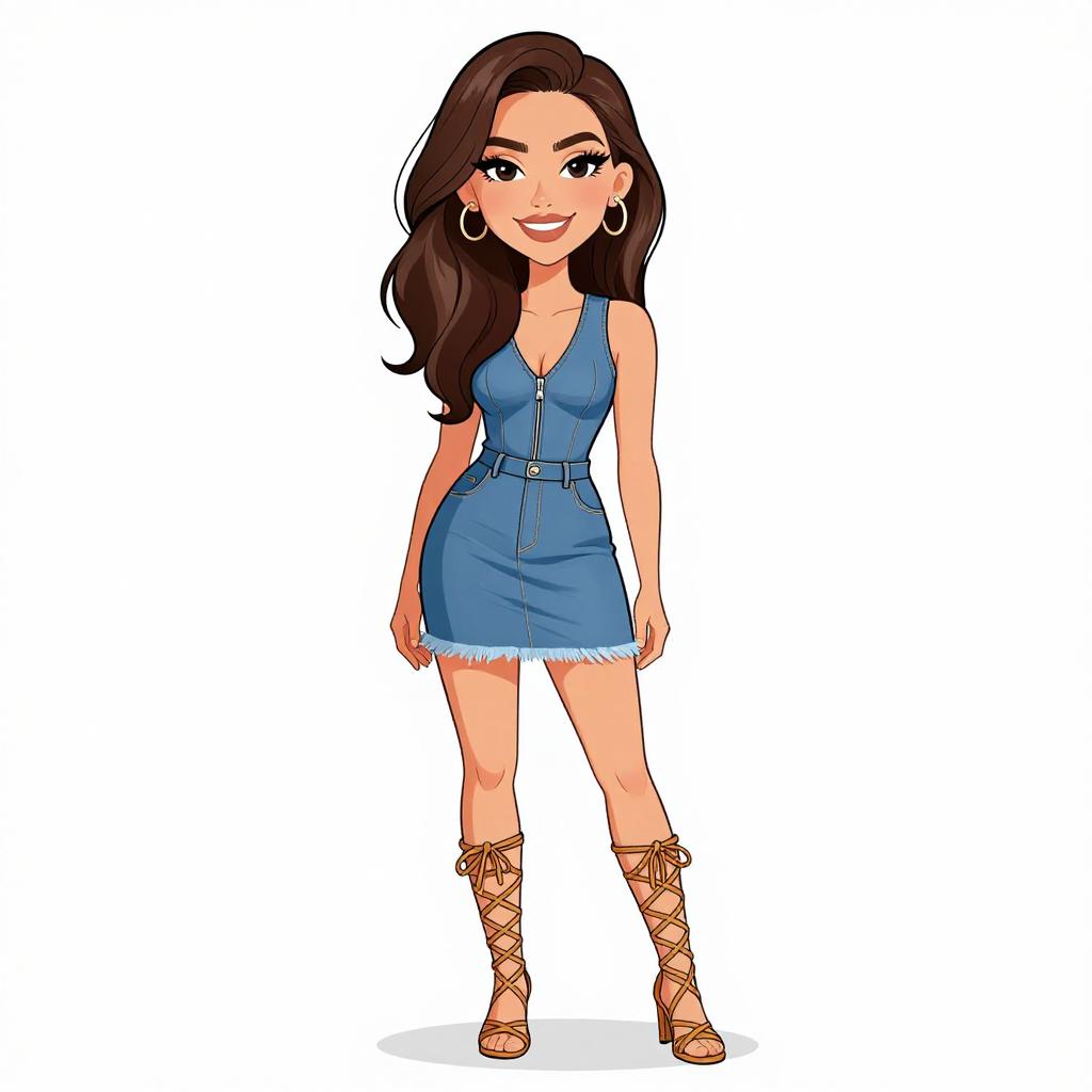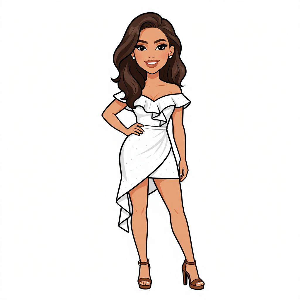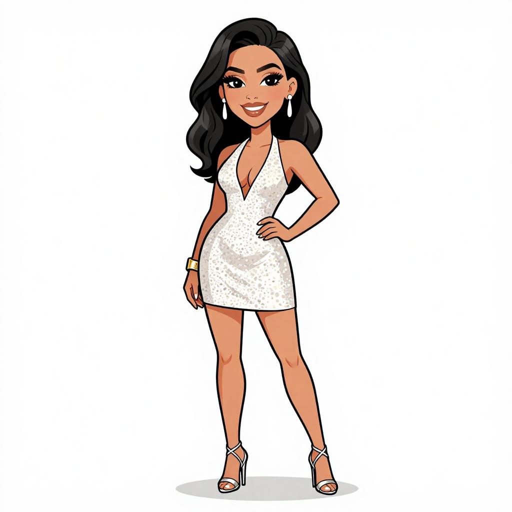 Woman with pretty face and pretty hair. smiling Woman, cocktail chic, satin mini dress in champagne hue, spaghetti straps, deep V-neckline with twist detail, slightly flared skirt silhouette, nude strappy heels, white background. --sref 1467