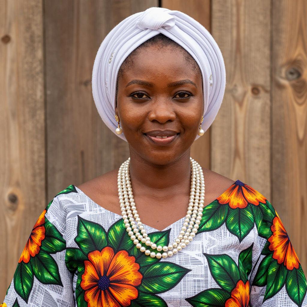 Portrait of a smiling Nigerian woman wearing traditional African attire with red and gray geometric patterns. She has a matching headwrap, white beaded necklace, and gold bangles. She stands outdoors on a sunny day in a garden pathway surrounded by vibrant pink, red, and yellow flowers with green foliage in the background.