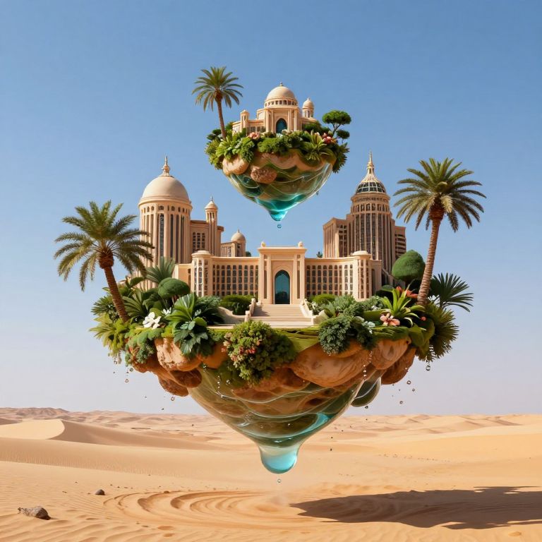 Digital artwork of futuristic desert oasis: floating city with domes, palm trees, lush greenery, and blue glass supports, set against a clear blue