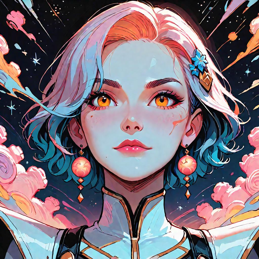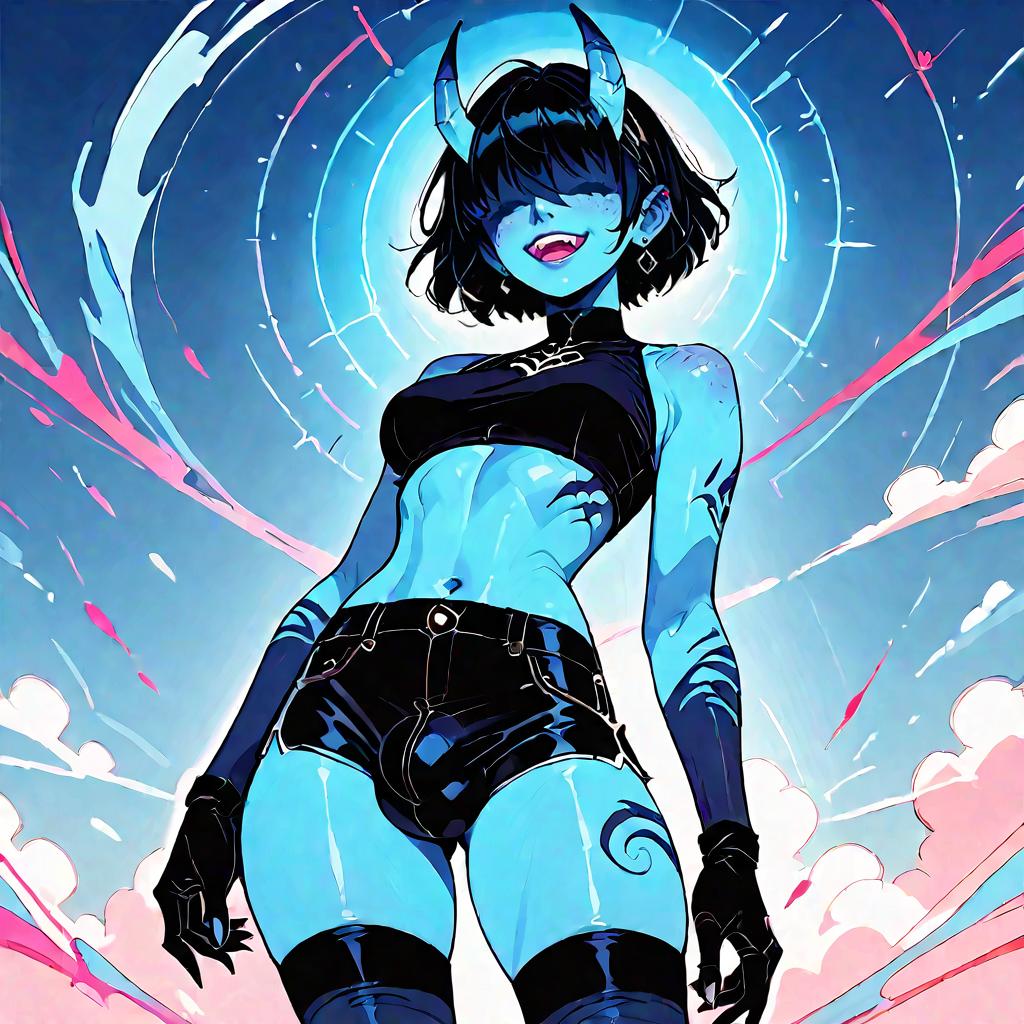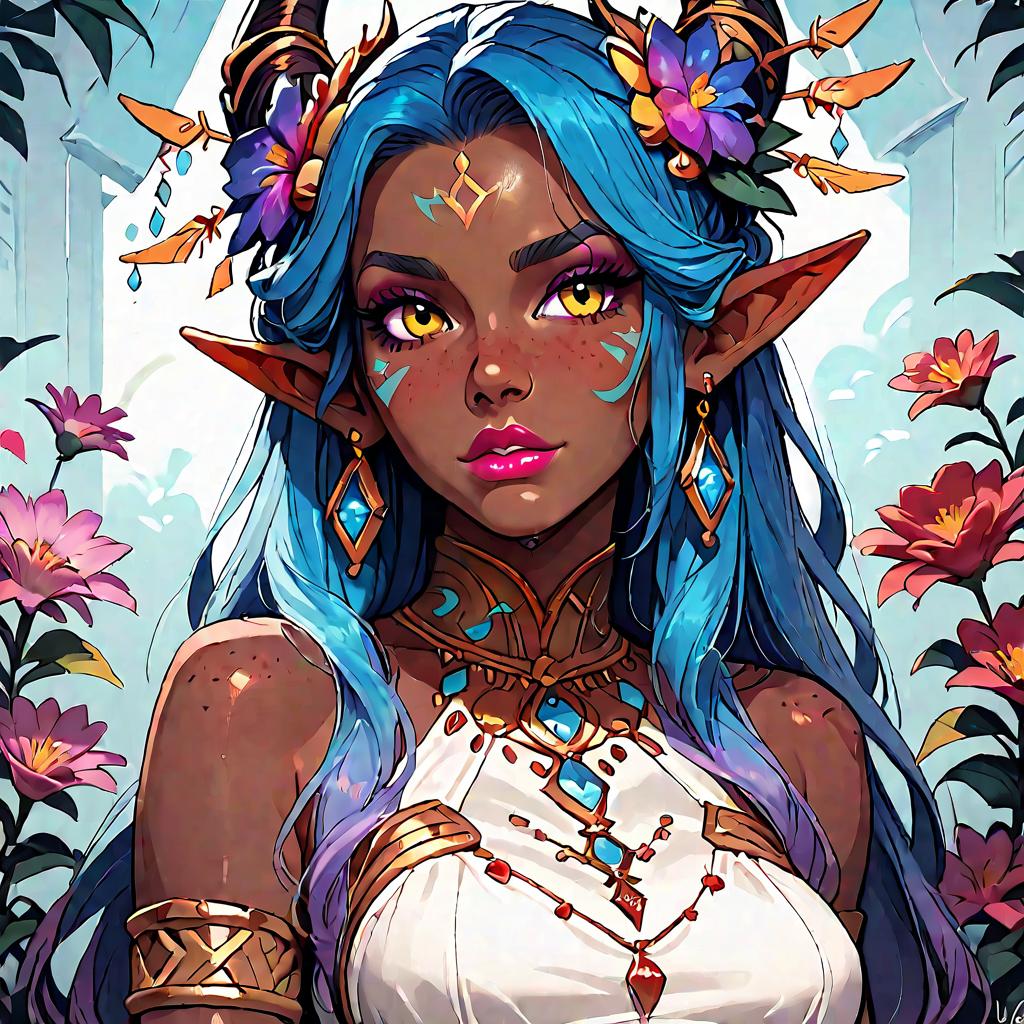 Digital artwork of a samurai tiefling character with blue skin, glowing yellow eyes, white hair, and prominent horns. The character has a mystical sun-like symbol on the forehead and wears a samurai-inspired garment. The background features dramatic clouds with warm lighting effects.