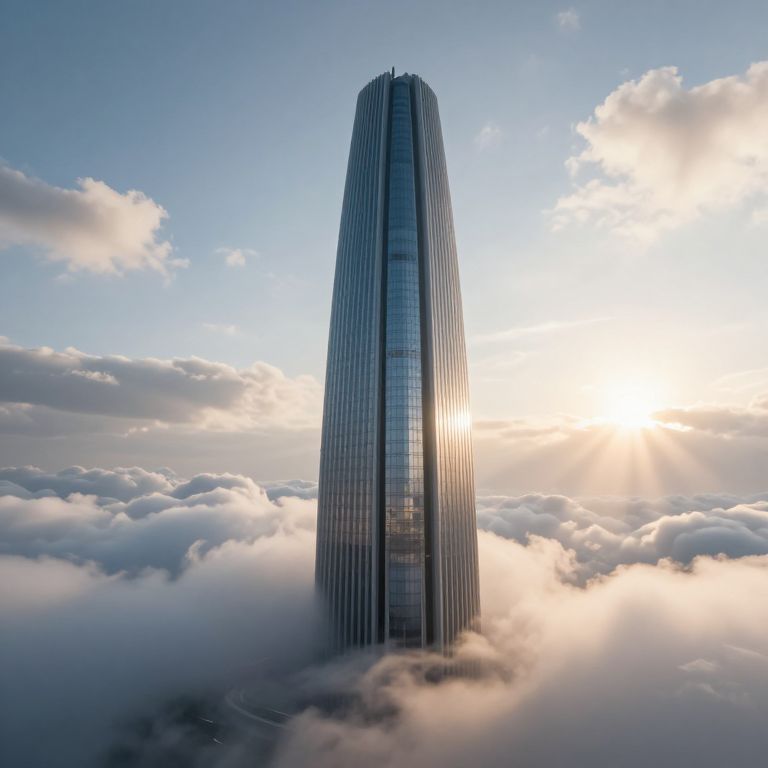 A magnificent modern tower that go straight up to the clouds, neoclassical architecture, early morning sunhine, god rays, unreal engine, hyperdetailed, archdaily, by jorge jacinto