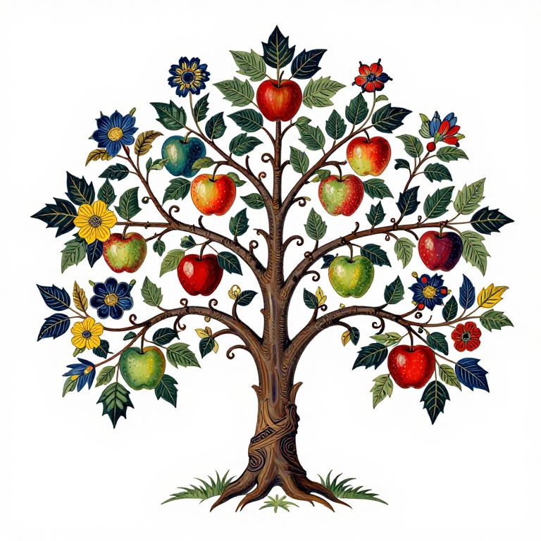 Colorful, detailed illustration of a tree with red, green apples, blue and yellow flowers, and dark green leaves on a white background.