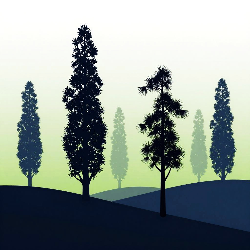This is a digital art piece featuring a surreal landscape with tall, slender trees in dark blue and black silhouettes. The background has a gradient from white at the top to a pale green and yellow in the middle, creating a dreamy atmosphere. The trees are scattered across rolling hills, with the bottom of the image showing a darker blue, almost navy, foreground. The overall style is abstract and slightly eerie.