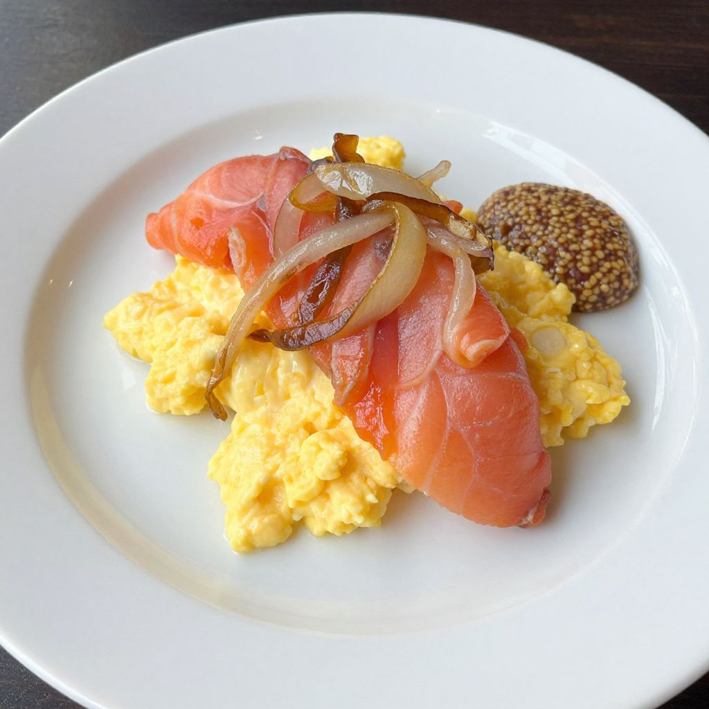 Photograph of a white plate with yellow scrambled eggs, sliced pink smoked salmon, caramelized onions, and a small ball of black and white speck